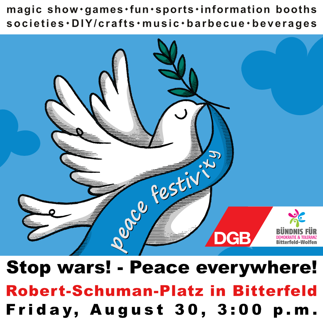Wir laden euch herzlich ein zu unserem Friedensfest! Kommt am Freitag, den 30. August 2024, von 15:00 bis 18:00 Uhr zum Robert-Schuman-Platz im Ortsteil Bitterfeld. Lasst uns gemeinsam ein Zeichen für Frieden, Zusammenhalt und Gemeinschaft setzen! 🤝❤️ Freut euch auf ein buntes Programm mit Musik, Spielen und vielen tollen Aktivitäten für Groß und Klein.